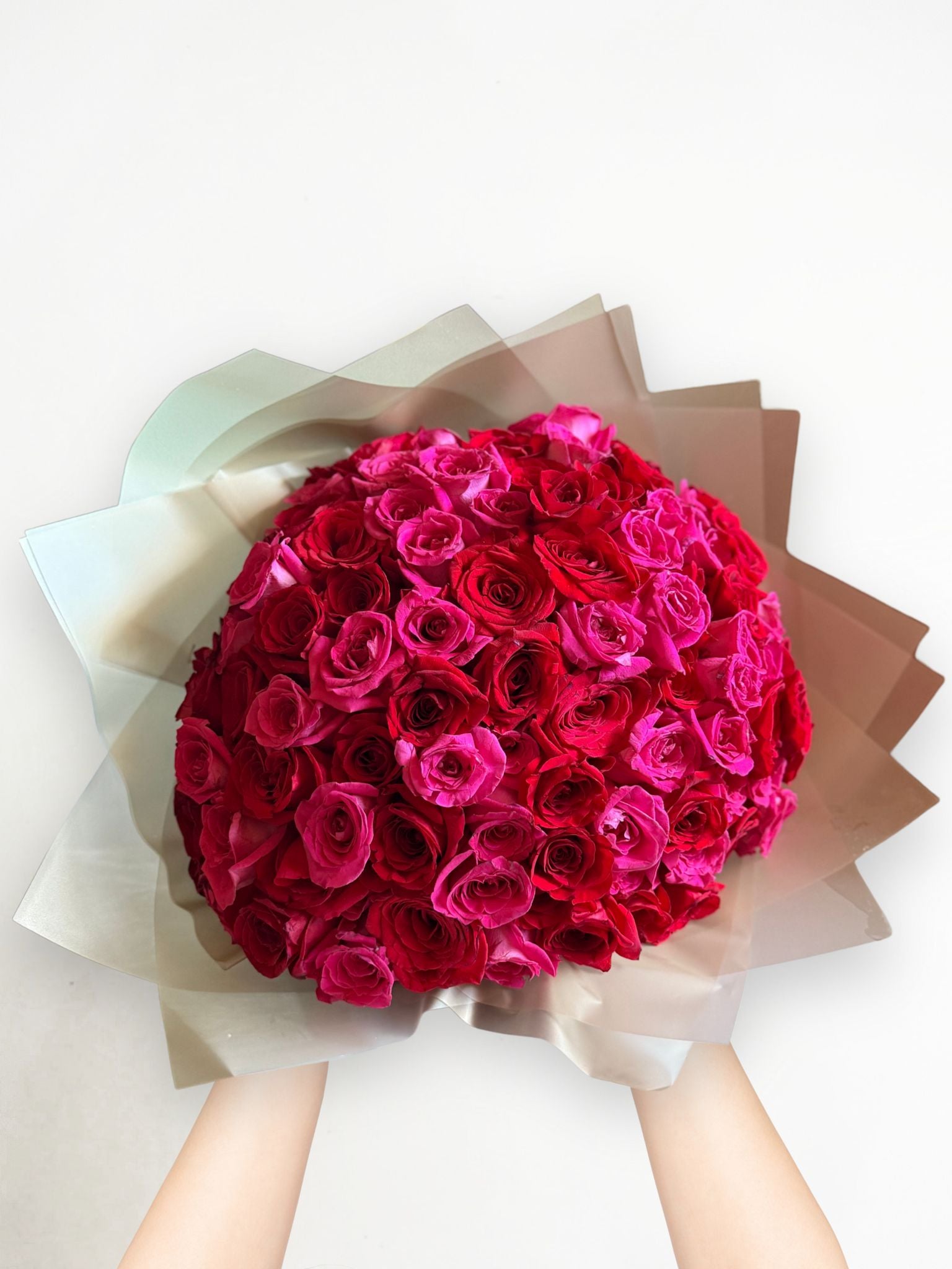 Incluye: 100 rosas en dos tonos combinados y una tarjetita con frase especial para mamá.