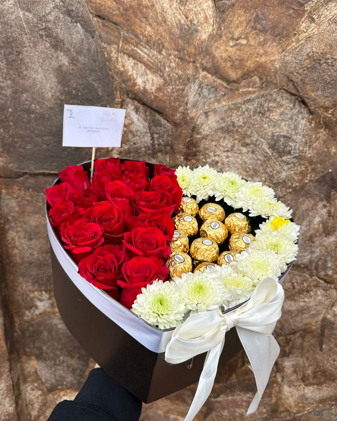 Arreglo en forma de corazón con rosas rojas, ferrero & pompom