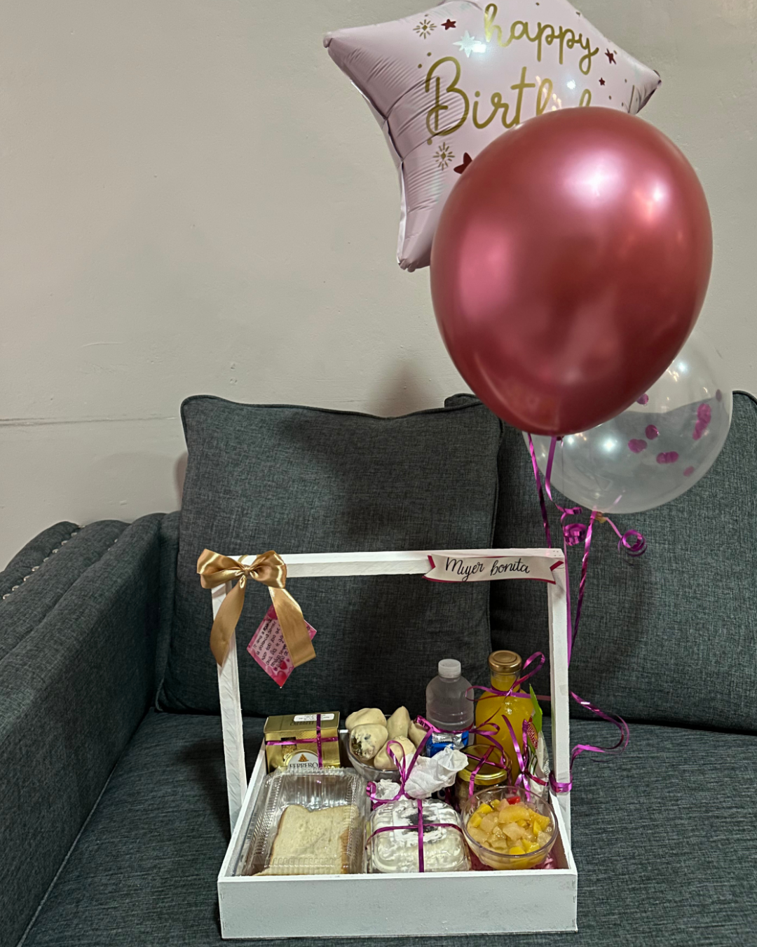 Incluye Sandwich, cheescake, bowl de frutas, fresas con chocolate, cajita de ferrero, agua, jugo de naranja.