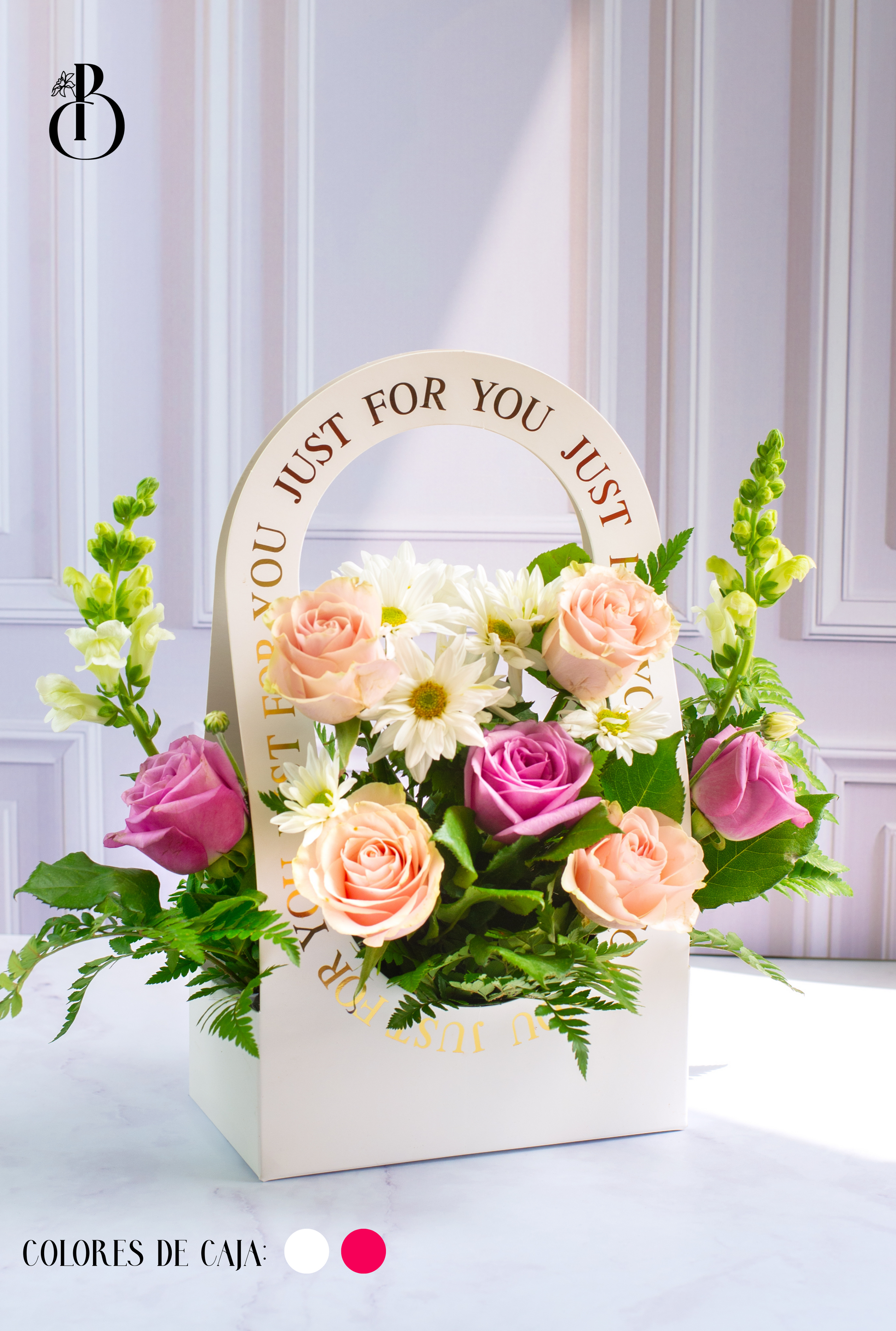 Incluye: 3 rosas moradas , 4 rosas rosadas, 6 margaritas blancas, 2 dragon blanco, erul , lisianthus blanco & tarjeta alusiva al dia de la madre