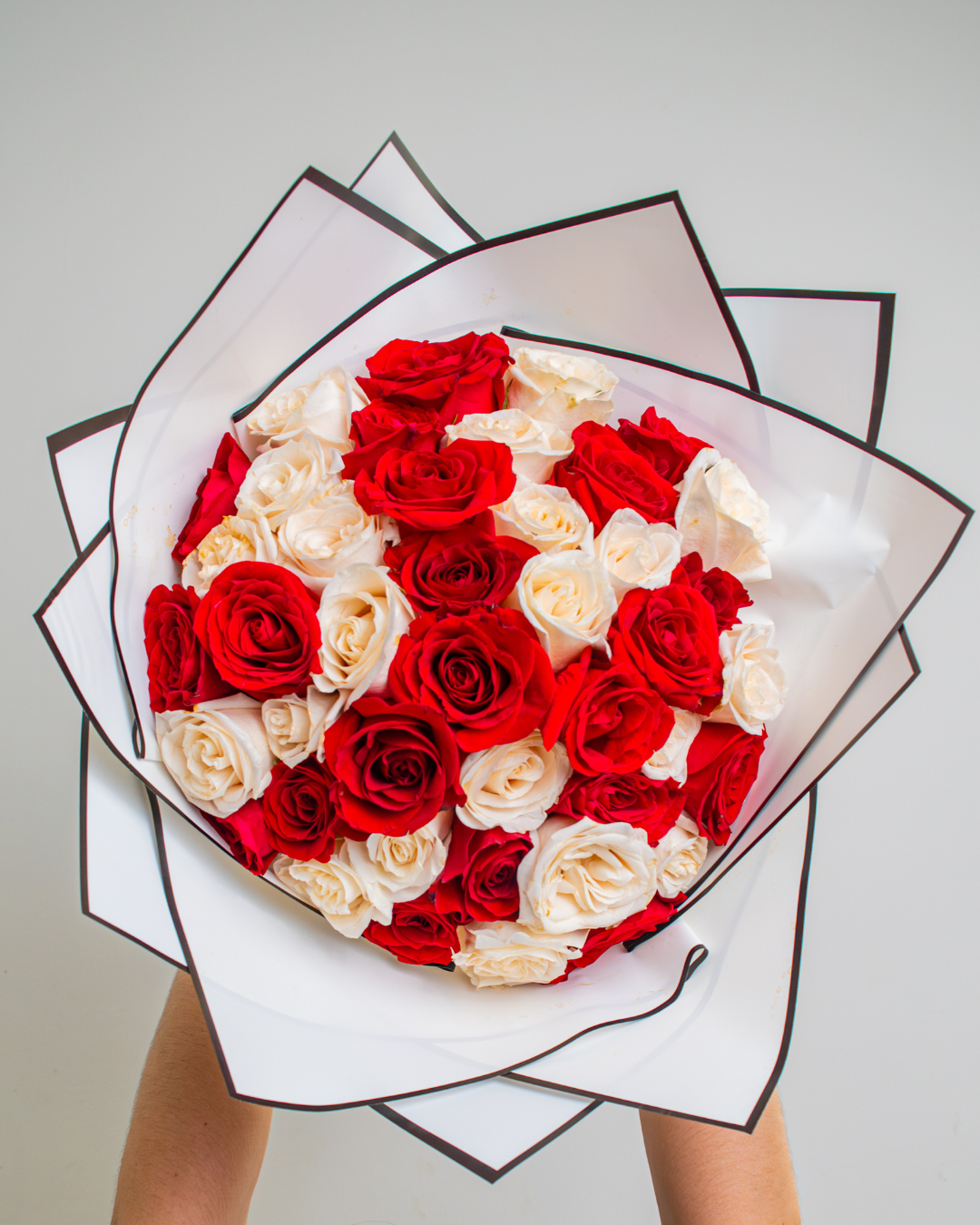 Hermoso ramo de 50 rosas en tonos blancos y rojos