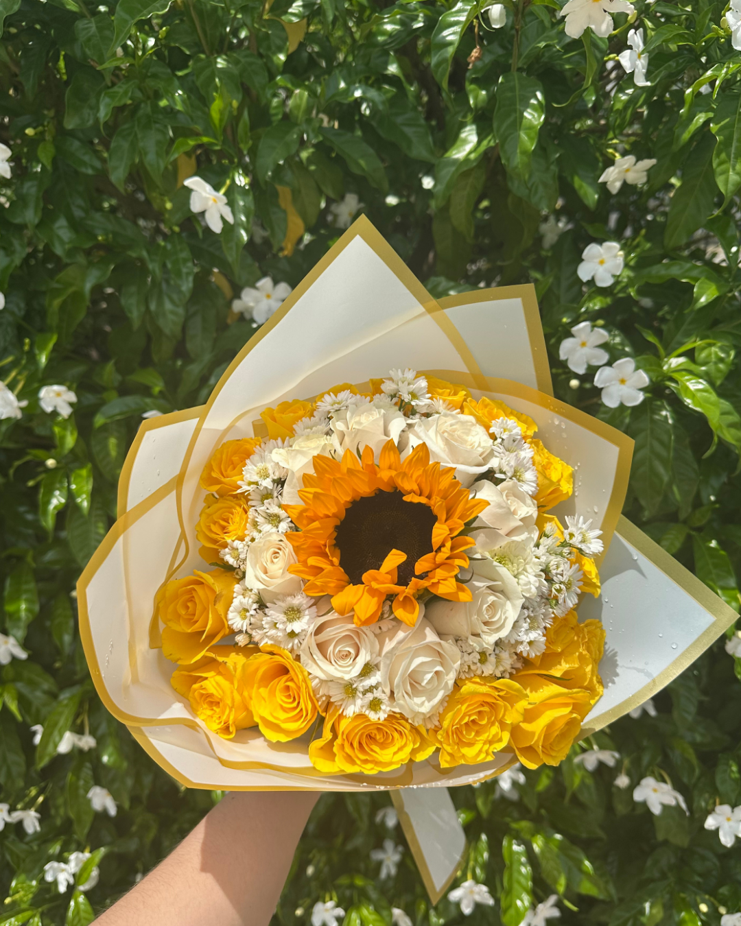 Ramo de 1 girasol , rosas blancas , rosas amarillas & flores de manzanilla