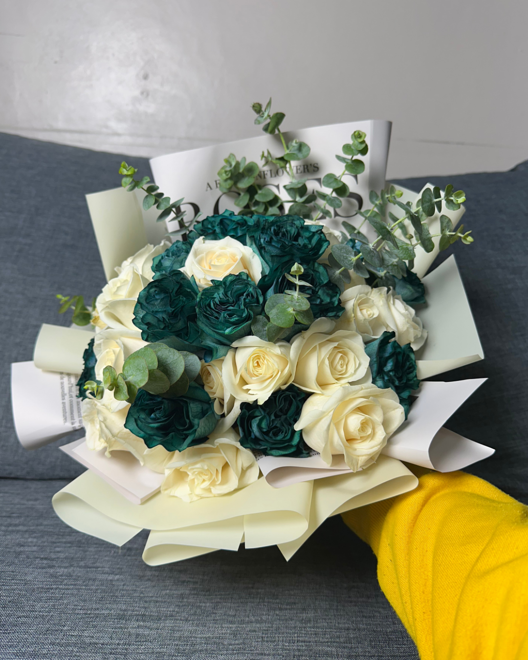 12 rosas color blanco & 12 rosas color verde acompañado con eucalipto