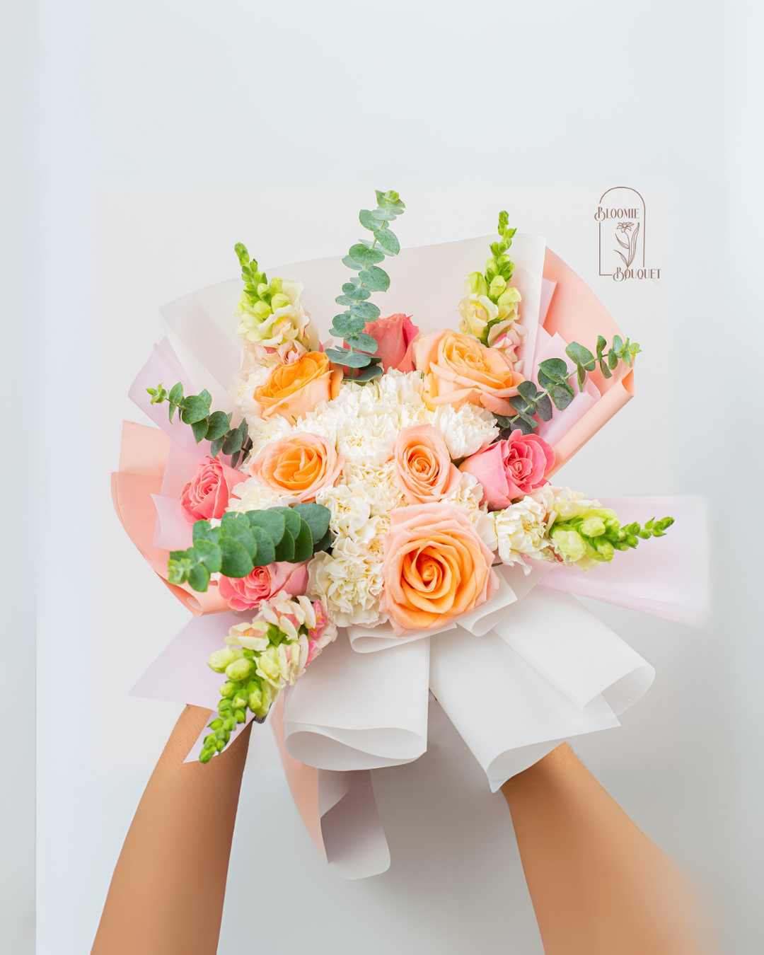 6 rosas color salmon & 6 rosas rosadas acompañadas con claveles blancos junto con dragon & dolar