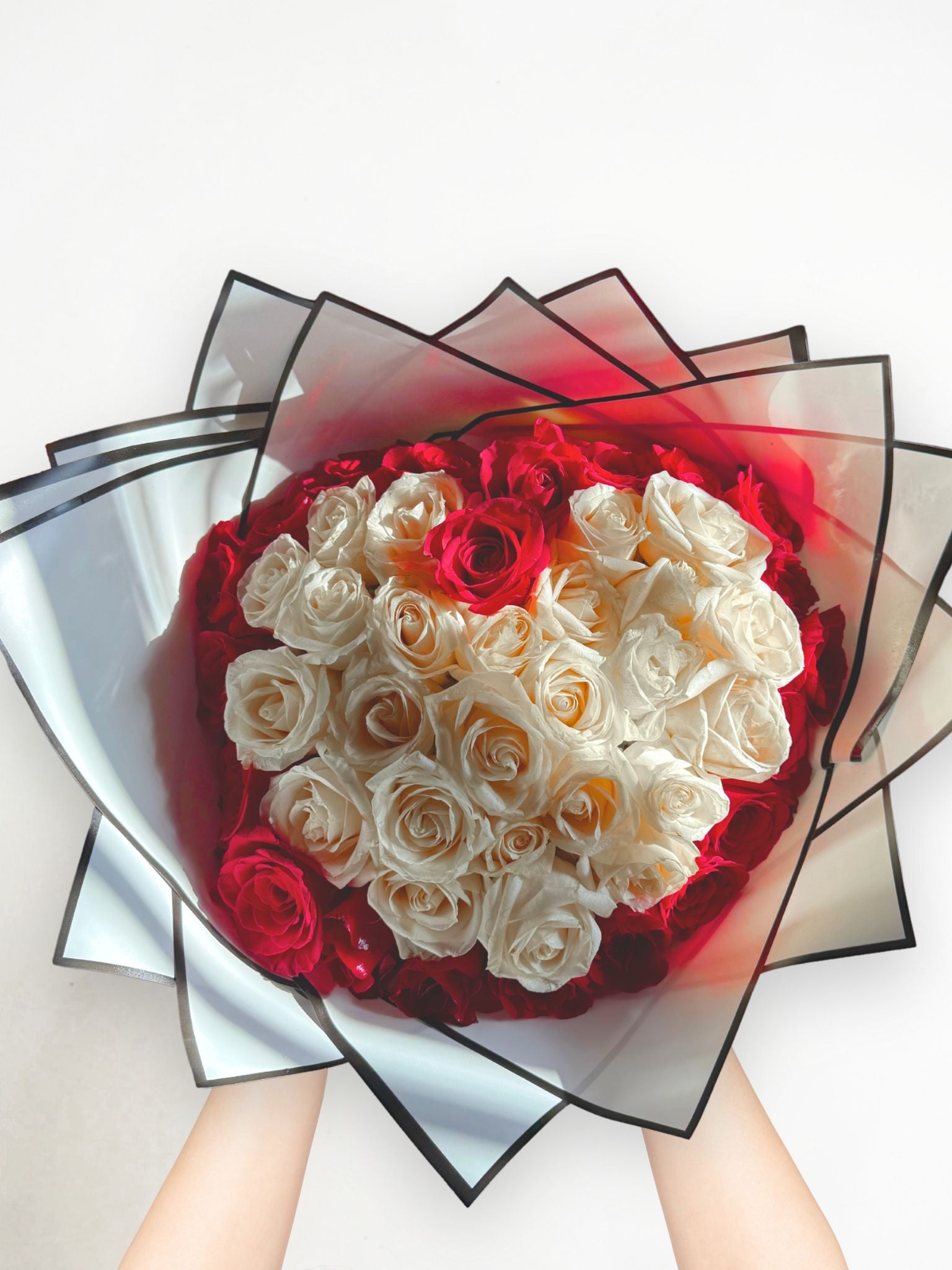 Incluye: 50 rosas dispuestas en forma de corazón y una tarjetita con una frase especial para mamá.